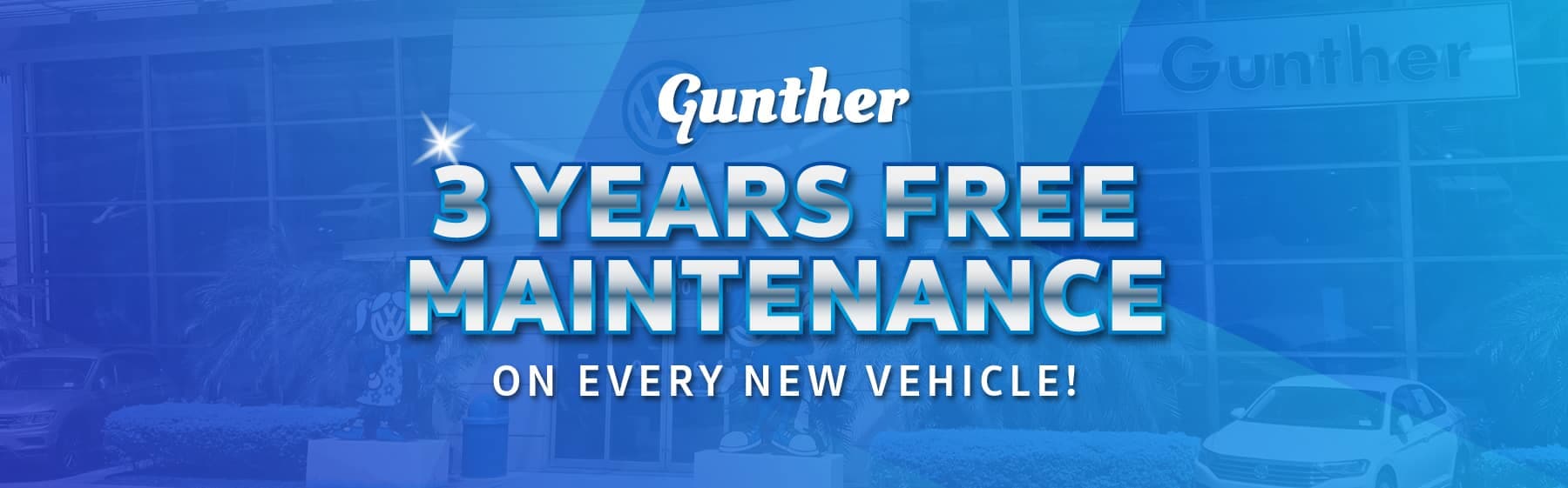 Receive 3 years free maintenance on any new Volkswagen vehicles purchased or leased from a Gunther Volkswagen dealership only.
