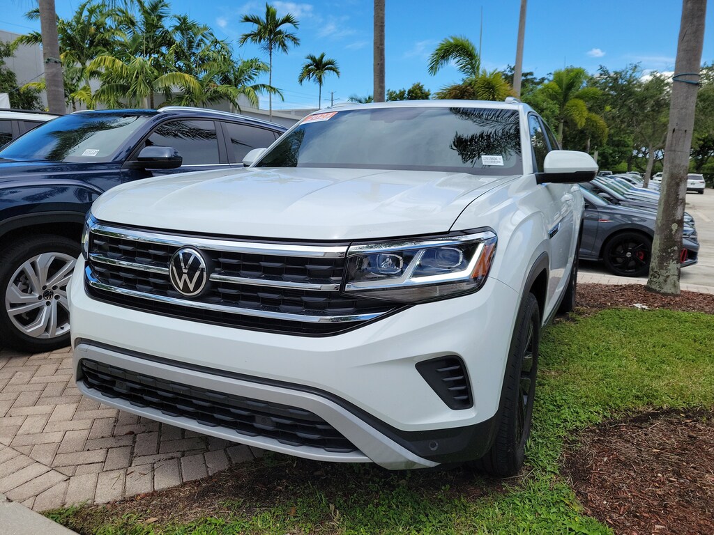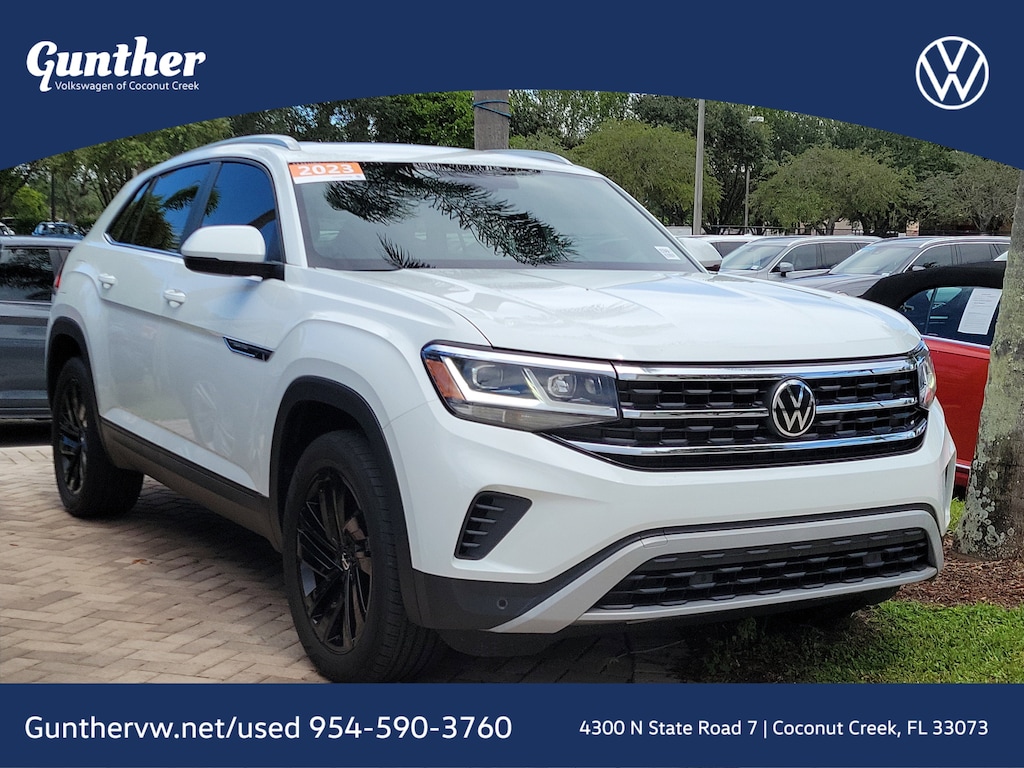 CARFAX One-Owner. Certified. White 2023 Volkswagen Atlas Cross Sport 3.6L V6 SE w/Technology 3.6L VR6 8-Speed Automatic with Tiptronic FWD 3.60 Axle Ratio, 4-Wheel Disc Brakes, 6 Speakers, ABS brakes, Air Conditioning, Alloy wheels, AM/FM radio: SiriusXM with 360L, Auto-dimming Rear-View mirror, Automatic temperature control, Brake assist, Bumpers: body-color, Compass, Delay-off headlights, Driver door bin, Driver vanity mirror, Dual front impact airbags, Dual front side impact airbags, Electronic Stability Control, Emergency communication system: VW Car-Net Safe & Secure 5-year, Exterior Parking Camera Rear, Four wheel independent suspension, Front anti-roll bar, Front Bucket Seats, Front Center Armrest, Front dual zone A/C, Front fog lights, Front reading lights, Fully automatic headlights, Heated Comfort Front Bucket Seats, Heated door mirrors, Heated front seats, Illuminated entry, Leather Shift Knob, Low tire pressure warning, Occupant sensing airbag, Outside temperature display, Overhead airbag, Overhead console, Panic alarm, Passenger door bin, Passenger vanity mirror, Perforated V-Tex Leatherette Seating Surfaces, Power door mirrors, Power driver seat, Power Liftgate, Power steering, Power windows, Radio data system, Radio: MIB3 Composition Media w/8" Touchscreen, Rain sensing wipers, Rear anti-roll bar, Rear reading lights, Rear seat center armrest, Rear window defroster, Rear window wiper, Remote keyless entry, Security system, Speed control, Speed-sensing steering, Split folding rear seat, Spoiler, Standard Suspension, Steering wheel mounted audio controls, Tachometer, Telescoping steering wheel, Tilt steering wheel, Traction control, Trip computer, Turn signal indicator mirrors, Variably intermittent wipers, and Wheels: 20" x 8J 5-Spoke Silver Painted Alloy.