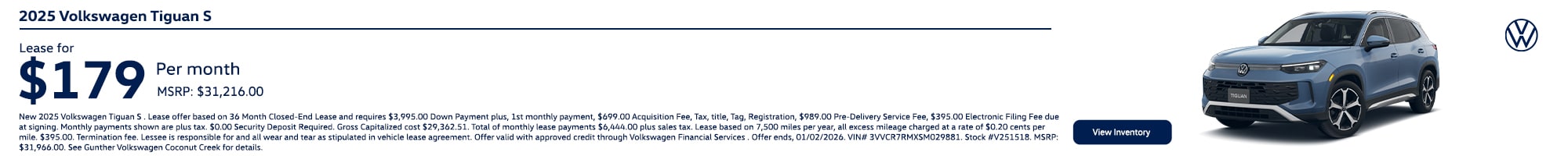 Our dealership team is proud to offer the 2025 Volkswagen Tiguan to drivers in Coconut Creek, FL. At Gunther Volkswagen of Coconut Creek, we work hard to help all of our customers get behind the wheel of their dream ride. Our Volkswagen lease specials make it easier to save. Visit us today at our lot near Pompano Beach, FL, to slip inside the new Volkswagen Tiguan for sale.