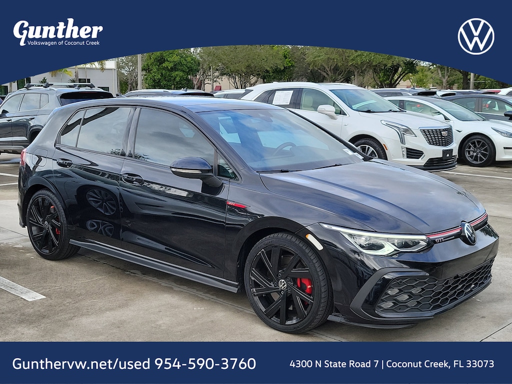 Deep Black 2022 Volkswagen Golf GTI 2.0T SE 2.0L TSI DOHC 7-Speed DSG Automatic with Tiptronic FWD Black Wheel Package (18" Black Alloy Wheels), SE Leather Package (Actively Ventilated Front Seats, Padded Door Panels w/Leatherette Inserts, and Vienna Leather Seating Surfaces), 4-Wheel Disc Brakes, 9 Speakers, ABS brakes, Air Conditioning, Alloy wheels, AM/FM radio: SiriusXM with 360L, Auto-dimming Rear-View mirror, Auto-Dimming Rearview Mirror w/HomeLink, Automatic temperature control, Brake assist, Bumpers: body-color, Cloth Seating Surfaces, Compass, Delay-off headlights, Driver door bin, Driver vanity mirror, Dual front impact airbags, Dual front side impact airbags, Electronic Stability Control, Emergency communication system: VW Car-Net services (capabilities require enrollment or subscription), Exterior Parking Camera Rear, First Aid Kit, Forward collision: FCW w/Autonomous Emergency Braking mitigation, Four wheel independent suspension, Front anti-roll bar, Front Bucket Seats, Front Center Armrest, Front fog lights, Front reading lights, Fully automatic headlights, harman kardon Audio Delete, harman/kardon® Speakers, Heated door mirrors, Heated front seats, Heated Front Top Sport Seats, Heated steering wheel, Illuminated entry, Lane Departure Warning System, Leather steering wheel, Low tire pressure warning, Navigation System, Occupant sensing airbag, Outside temperature display, Overhead airbag, Overhead console, Panic alarm, Passenger door bin, Passenger vanity mirror, Power door mirrors, Power driver seat, Power moonroof: Panoramic, Power passenger seat, Power steering, Power windows, Radio data system, Radio: MIB3 Discover Pro w/10" Touchscreen Navi, Rain sensing wipers, Rear anti-roll bar, Rear reading lights, Rear seat center armrest, Rear window defroster, Rear window wiper, Remote keyless entry, Roadside Assistance Kit, Rubber Mats Kit, Security system, Speed control, Speed-sensing steering, Speed-Sensitive Wipers, Split folding rear seat, Spoiler, Sport steering wheel, Steering wheel mounted audio controls, Tachometer, Telescoping steering wheel, Tilt steering wheel, Traction control, Trip computer, Turn signal indicator mirrors, Variably intermittent wipers, and Wheels: 18" x 7.5J 2-Tone Machined Alloy.
