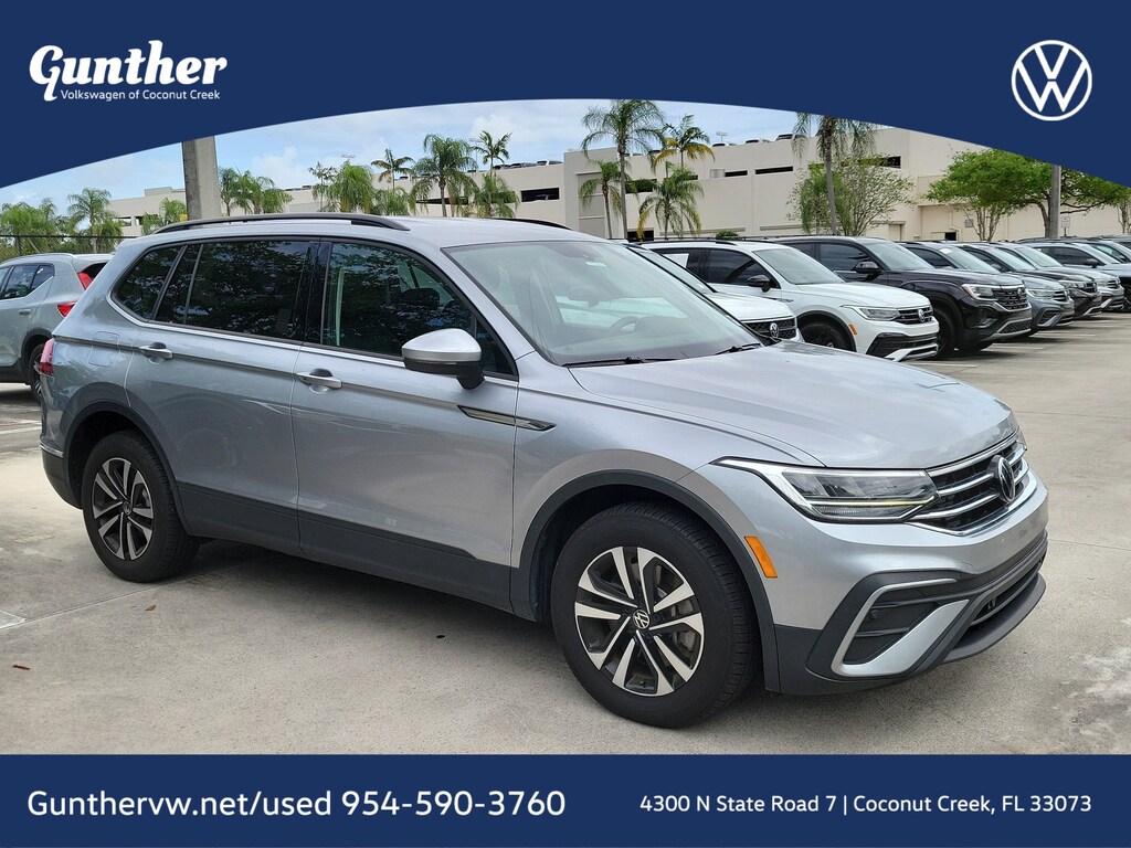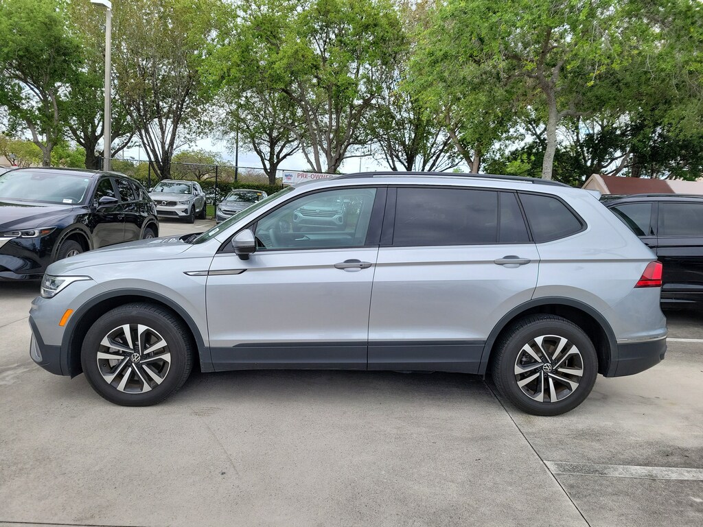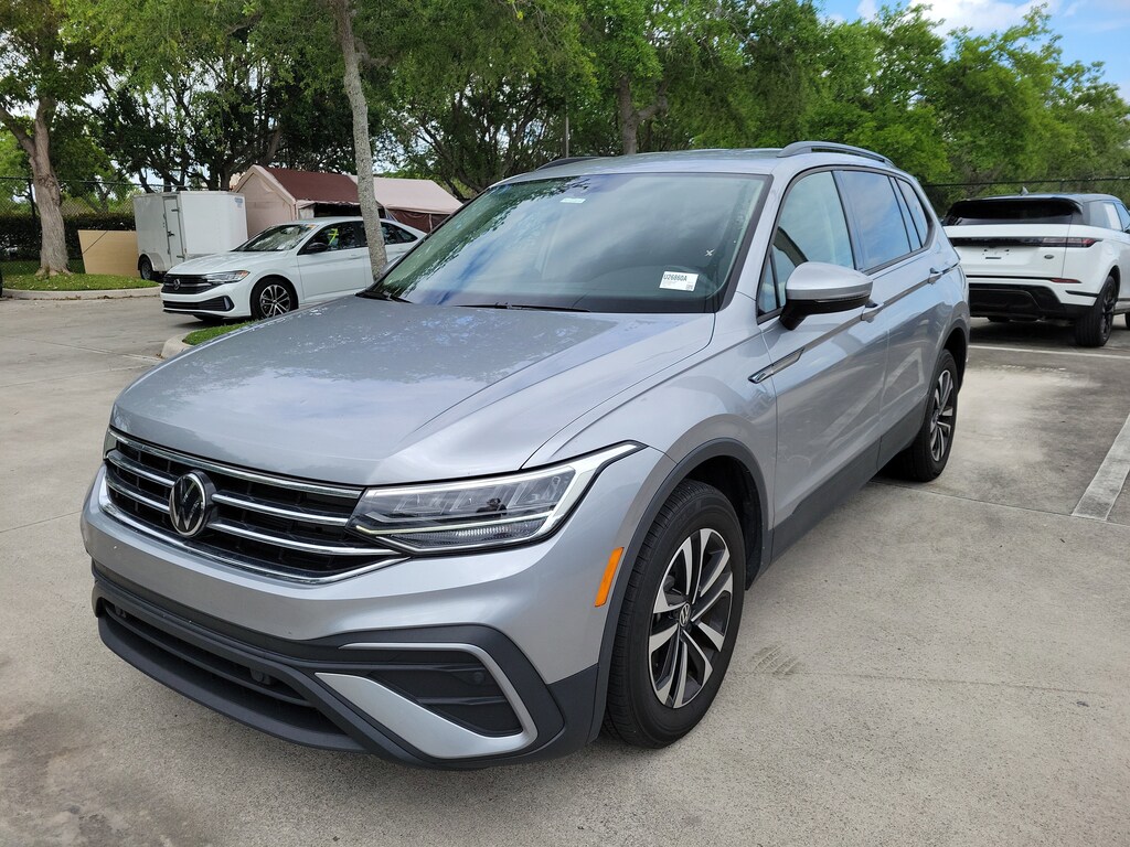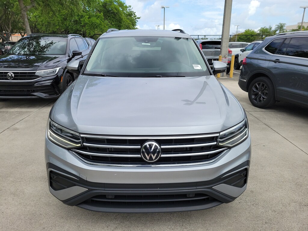 Recent Arrival! CARFAX One-Owner. Silver Metallic 2023 Volkswagen Tiguan 2.0T S 2.0L TSI DOHC 8-Speed Automatic with Tiptronic FWD 3-Row Rubber Monster Mats w/Logo Kit (Set of 5), 3.33 Axle Ratio, 3rd row seats: bench, 4-Wheel Disc Brakes, 4-Wheel Independent Suspension, 6 Speakers, ABS brakes, Air Conditioning, Alloy wheels, AM/FM radio, Brake assist, Bumpers: body-color, Cloth Seating Surfaces, Compass, Delay-off headlights, Driver door bin, Driver vanity mirror, Dual front impact airbags, Dual front side impact airbags, Electronic Stability Control, Emergency communication system: VW Car-Net Safe & Secure 5-year, Exterior Parking Camera Rear, First Aid Kit, Forward collision: FCW w/Autonomous Emergency Braking mitigation, Four wheel independent suspension, Front anti-roll bar, Front Bucket Seats, Front Center Armrest, Front reading lights, Fully automatic headlights, Heated door mirrors, Heated Front Bucket Seats, Heated front seats, Heavy Duty Trunk Liner w/VW CarGo Blocks, Illuminated entry, Leather Shift Knob, Low tire pressure warning, Occupant sensing airbag, Outside temperature display, Overhead airbag, Overhead console, Panic alarm, Passenger door bin, Passenger vanity mirror, Power door mirrors, Power steering, Power windows, Radio data system, Radio: Composition Color AM/FM, Rear anti-roll bar, Rear reading lights, Rear seat center armrest, Rear window defroster, Rear window wiper, Remote keyless entry, Roadside Assistance Kit, Speed control, Speed-sensing steering, Split folding rear seat, Spoiler, Steering wheel mounted audio controls, Tachometer, Telescoping steering wheel, Tilt steering wheel, Traction control, Trip computer, Turn signal indicator mirrors, Variably intermittent wipers, VW Car-Net Safe & Secure 5-Year Plan, and Wheels: 17" 2-Tone Machined Twin 5-Spoke Alloy.