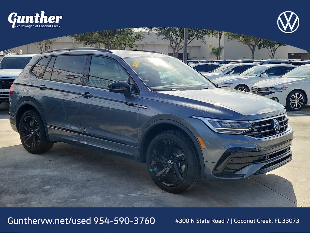 CARFAX One-Owner. Platinum Gray Metallic 2023 Volkswagen Tiguan 2.0T SE R-Line Black 2.0L TSI DOHC 8-Speed Automatic with Tiptronic FWD 3-Row Rubber Monster Mats w/Logo Kit (Set of 5), 3.33 Axle Ratio, 3rd row seats: bench, 4-Wheel Disc Brakes, 4-Wheel Independent Suspension, 6 Speakers, ABS brakes, Air Conditioning, Alloy wheels, AM/FM radio: SiriusXM with 360L, Auto-dimming Rear-View mirror, Auto-Dimming Rearview Mirror w/Compass/HomeLink (DISC), Automatic temperature control, Brake assist, Bumpers: body-color, Cargo Area Retractable Privacy Cover, Compass, Credit - Power Rear Liftgate Removed, Credit - Steering Wheel Substitution, Delay-off headlights, Driver door bin, Driver vanity mirror, Dual front impact airbags, Dual front side impact airbags, Electronic Stability Control, Emergency communication system: VW Car-Net Safe & Secure 5-year, Exterior Parking Camera Rear, First Aid Kit, Four wheel independent suspension, Front anti-roll bar, Front Bucket Seats, Front Center Armrest, Front dual zone A/C, Front reading lights, Fully automatic headlights, Heated door mirrors, Heated Front Comfort Seats, Heated front seats, Heavy Duty Trunk Liner w/VW CarGo Blocks, Illuminated entry, Leather Shift Knob, Leather steering wheel, Low tire pressure warning, Occupant sensing airbag, Outside temperature display, Overhead airbag, Overhead console, Panic alarm, Passenger door bin, Passenger vanity mirror, Perforated V-Tex Leatherette Seating Surfaces, Power door mirrors, Power driver seat, Power Liftgate, Power moonroof, Power steering, Power windows, Radio data system, Radio: MIB3 Composition Media AM/FM/HD, Rain sensing wipers, Rear anti-roll bar, Rear reading lights, Rear seat center armrest, Rear window defroster, Rear window wiper, Remote keyless entry, Roadside Assistance Kit, Roof Rack Base Carrier Bars (Set of 2), Security system, Speed control, Speed-sensing steering, Split folding rear seat, Spoiler, Sport steering wheel, Steering wheel mounted audio controls, Tachometer, Telescoping steering wheel, Tilt steering wheel, Traction control, Trip computer, Turn signal indicator mirrors, Variably intermittent wipers, and Wheels: 19" Black Painted Twin 5-Spoke Alloy.