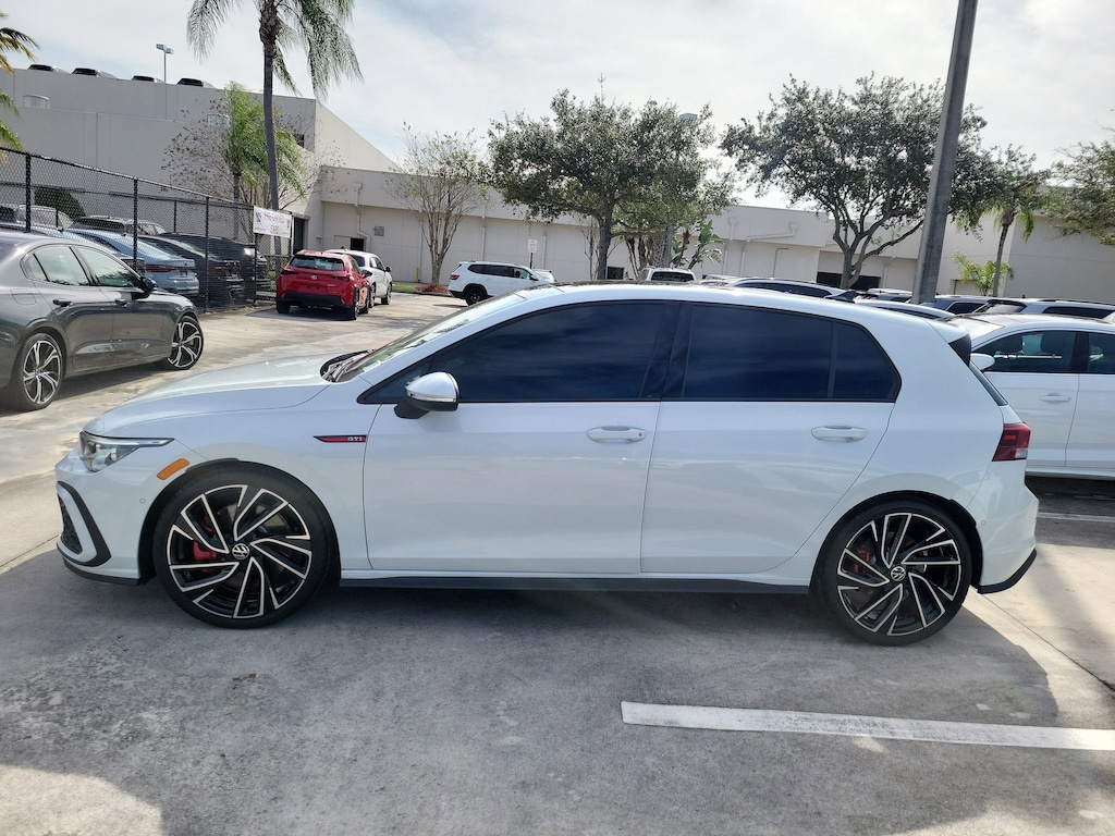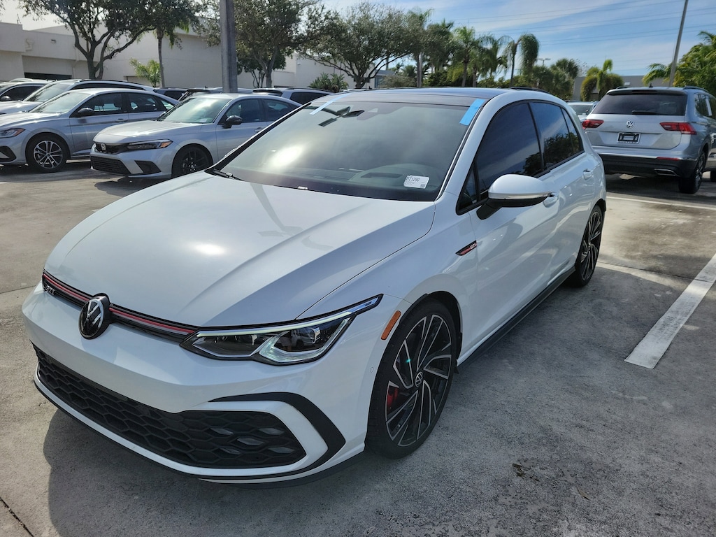 CARFAX One-Owner. Opal White 2024 Volkswagen Golf GTI Autobahn 2.0L TSI DOHC 7-Speed DSG Automatic with Tiptronic FWD 4-Wheel Disc Brakes, 9 Speakers, ABS brakes, Active Blind Spot Monitor, Adaptive suspension, Air Conditioning, Alloy wheels, AM/FM radio: SiriusXM with 360L, Auto High-beam Headlights, Auto-dimming Rear-View mirror, Automatic temperature control, Brake assist, Bumpers: body-color, Compass, Delay-off headlights, Driver door bin, Driver vanity mirror, Dual front impact airbags, Dual front side impact airbags, Electronic Stability Control, Emergency communication system: VW Car-Net Safe & Secure 5-year, Exterior Parking Camera Rear, Forward collision: FCW w/Autonomous Emergency Braking mitigation, Four wheel independent suspension, Front anti-roll bar, Front Bucket Seats, Front Center Armrest, Front dual zone A/C, Front fog lights, Front reading lights, Fully automatic headlights, harman/kardon® Speakers, Heads-Up Display, Heated & Actively Ventilated Front Top Sport Seats, Heated door mirrors, Heated front seats, Heated rear seats, Heated steering wheel, Illuminated entry, Leather steering wheel, Low tire pressure warning, Memory seat, Navigation System, Occupant sensing airbag, Outside temperature display, Overhead airbag, Overhead console, Panic alarm, Passenger door bin, Passenger vanity mirror, Perforated Vienna Leather Seating Surfaces, Power door mirrors, Power driver seat, Power moonroof: Panoramic, Power passenger seat, Power steering, Power windows, Radio data system, Radio: MIB3 Discover Pro w/10" Touchscreen Navi, Rain sensing wipers, Rear air conditioning, Rear anti-roll bar, Rear reading lights, Rear seat center armrest, Rear window defroster, Rear window wiper, Remote keyless entry, Rubber Mats Kit, Security system, Speed control, Speed-sensing steering, Speed-Sensitive Wipers, Split folding rear seat, Spoiler, Sport steering wheel, Steering wheel mounted audio controls, Tachometer, Telescoping steering wheel, Tilt steering wheel, Traction control, Trip computer, Turn signal indicator mirrors, Variably intermittent wipers, Ventilated front seats, and Wheels: 19" 2-Tone Diamond-Turned Alloy.