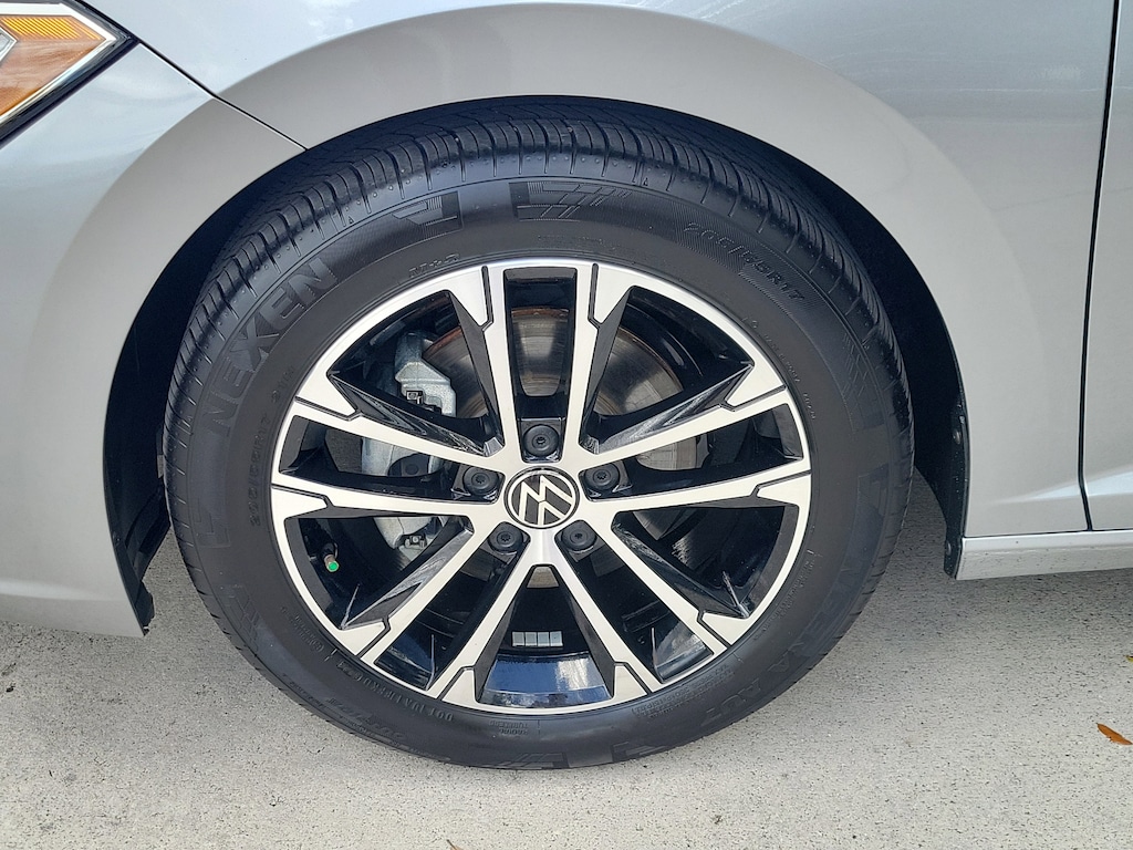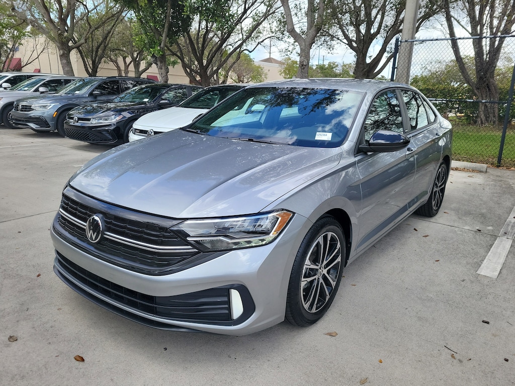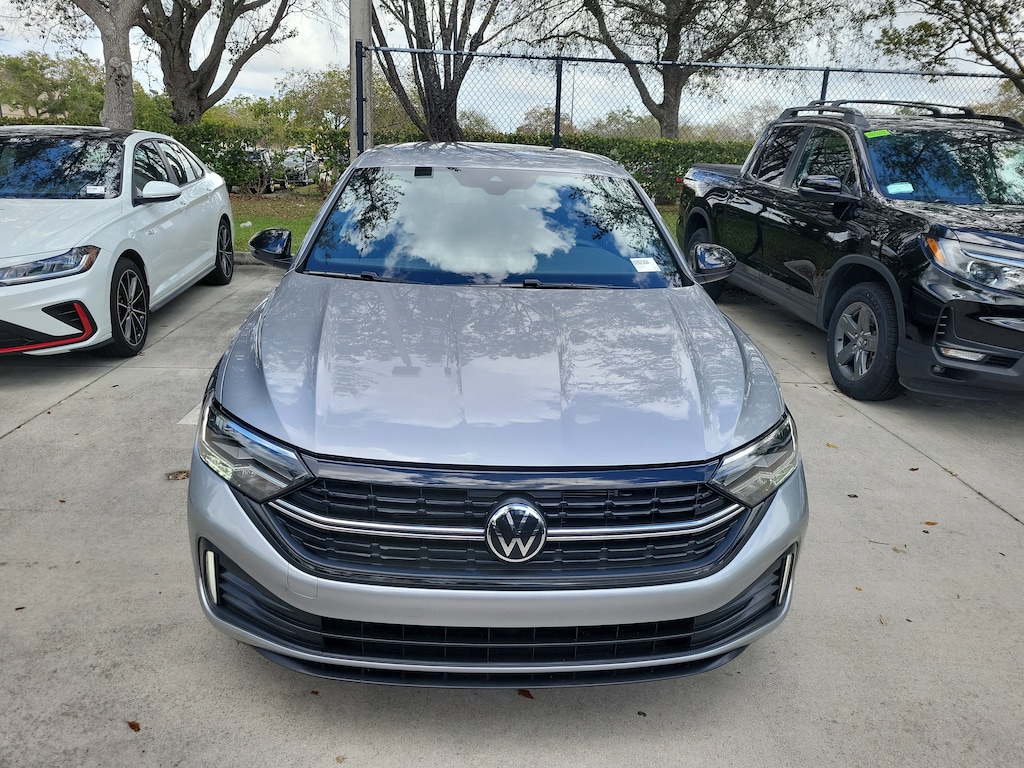 CARFAX One-Owner. Silver Metallic 2024 Volkswagen Jetta 1.5T Sport 1.5L I-4 DI DOHC Turbocharged 8-Speed Automatic with Tiptronic FWD 4 Speakers, 4-Wheel Disc Brakes, ABS brakes, Active Blind Spot Monitor, Air Conditioning, Alloy wheels, Auto-dimming Rear-View mirror, Brake assist, Bumpers: body-color, Cloth Seat Trim, Delay-off headlights, Driver door bin, Driver vanity mirror, Dual front impact airbags, Dual front side impact airbags, Electronic Stability Control, Emergency communication system: VW Car-Net Safe & Secure 5-year, Exterior Parking Camera Rear, First Aid Kit, Front anti-roll bar, Front Bucket Seats, Front Center Armrest, Front wheel independent suspension, Fully automatic headlights, Heated door mirrors, Heated Front Seats, Heated front seats, Heavy Duty Trunk Liner w/VW CarGo Blocks, Illuminated entry, Leather Shift Knob, Leather steering wheel, Low tire pressure warning, Occupant sensing airbag, Outside temperature display, Overhead airbag, Overhead console, Panic alarm, Passenger door bin, Passenger vanity mirror, Power door mirrors, Power steering, Power windows, Radio data system, Radio: MIB3 Composition Color w/6.5" Touchscreen, Rain sensing wipers, Rear anti-roll bar, Rear reading lights, Rear seat center armrest, Rear window defroster, Remote keyless entry, Roadside Assistance Kit, Rubber Monster Mats Kit (Set of 4), Speed control, Speed-sensing steering, Split folding rear seat, Steering wheel mounted audio controls, Tachometer, Telescoping steering wheel, Tilt steering wheel, Traction control, Trip computer, Variably intermittent wipers, and Wheels: 17" 2-Tone Machined Alloy.