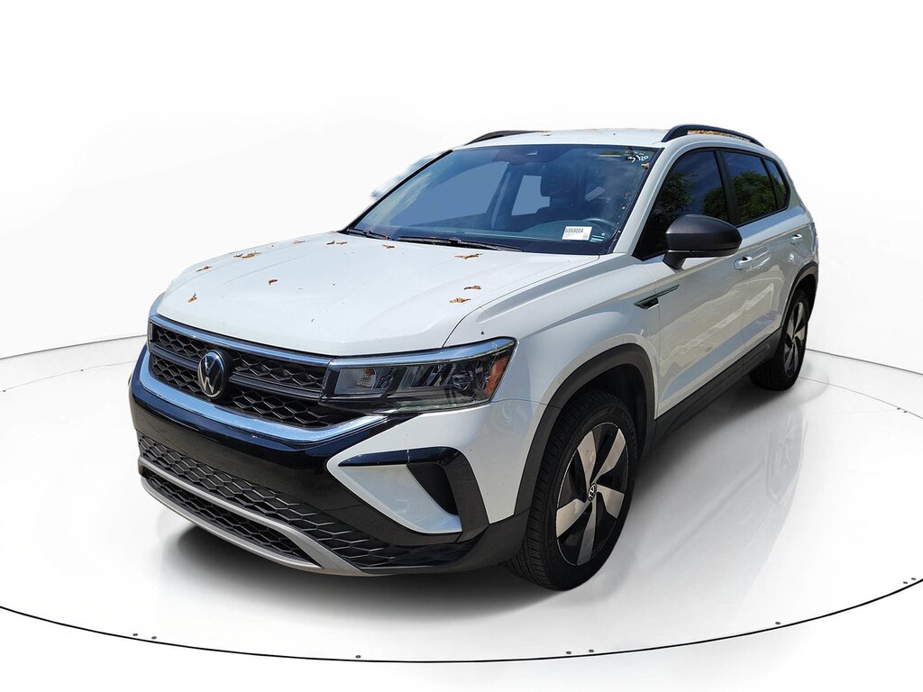 CARFAX One-Owner. Pure White 2024 Volkswagen Taos 1.5T S 1.5L I4 Turbocharged DOHC 16V LEV3-SULEV30 158hp 7-Speed DSG Automatic with Tiptronic AWD 4-Wheel Disc Brakes, 5.20 Axle Ratio, 6 Speakers, ABS brakes, Active Blind Spot Monitor, Air Conditioning, Alloy wheels, AM/FM radio, Auto High-beam Headlights, Brake assist, Bumpers: body-color, Cloth Seating Surfaces, Compass, Delay-off headlights, Driver door bin, Driver vanity mirror, Dual front impact airbags, Dual front side impact airbags, Electronic Stability Control, Emergency communication system: VW Car-Net Safe & Secure 5-year, Exterior Parking Camera Rear, Four wheel independent suspension, Front anti-roll bar, Front Bucket Seats, Front Center Armrest, Front reading lights, Front Strut Rear Multi-Link Suspension, Fully automatic headlights, Heated door mirrors, Heated Front Bucket Seats, Heated front seats, Heated steering wheel, Illuminated entry, Leather Shift Knob, Low tire pressure warning, Occupant sensing airbag, Outside temperature display, Overhead airbag, Overhead console, Panic alarm, Passenger door bin, Passenger vanity mirror, Power door mirrors, Power steering, Power windows, Radio data system, Radio: Composition Color AM/FM, Rain sensing wipers, Rear anti-roll bar, Rear seat center armrest, Rear window defroster, Rear window wiper, Remote keyless entry, Speed control, Speed-sensing steering, Split folding rear seat, Spoiler, Steering wheel mounted audio controls, Tachometer, Telescoping steering wheel, Tilt steering wheel, Traction control, Trip computer, Variably intermittent wipers, and Wheels: 18" 2-Tone Machined Alloy.