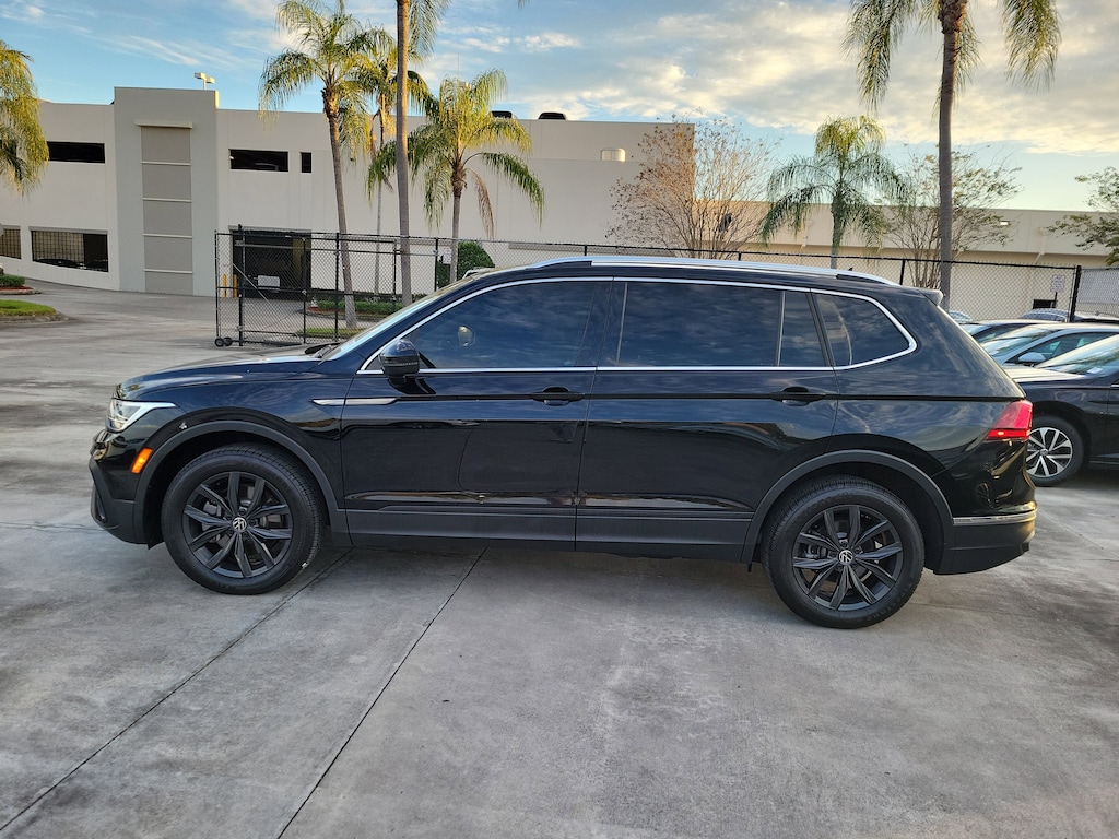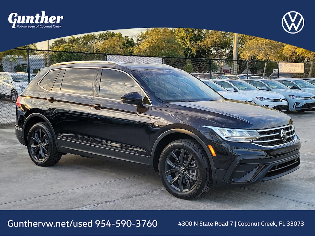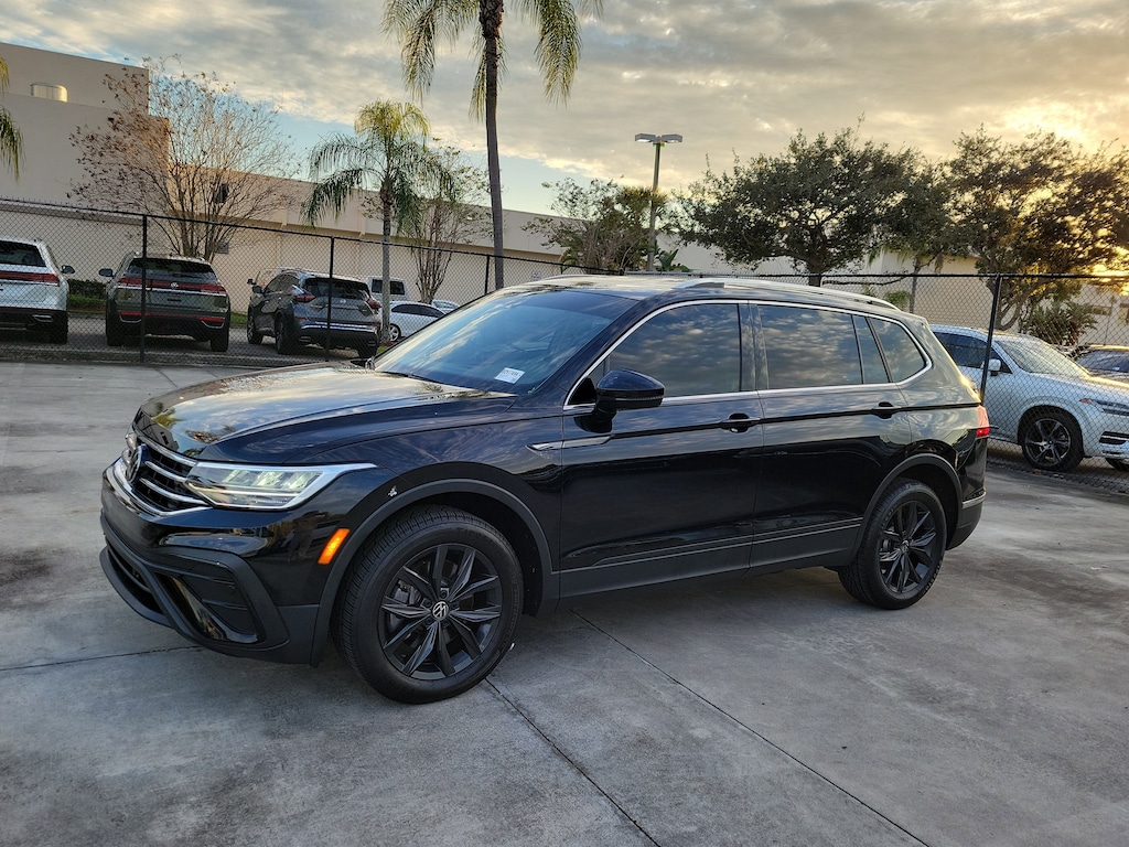 CARFAX One-Owner. Deep Black 2024 Volkswagen Tiguan 2.0T SE 2.0L TSI DOHC 8-Speed Automatic with Tiptronic FWD 3.33 Axle Ratio, 3rd row seats: bench, 4-Wheel Disc Brakes, 4-Wheel Independent Suspension, 6 Speakers, ABS brakes, Air Conditioning, Alloy wheels, AM/FM radio: SiriusXM with 360L, Auto-dimming Rear-View mirror, Auto-Dimming Rearview Mirror w/HomeLink Connect, Automatic temperature control, Brake assist, Bumpers: body-color, Compass, Delay-off headlights, Driver door bin, Driver vanity mirror, Dual front impact airbags, Dual front side impact airbags, Electronic Stability Control, Emergency communication system: VW Car-Net Safe & Secure 5-year, Exterior Parking Camera Rear, Four wheel independent suspension, Front anti-roll bar, Front Bucket Seats, Front Center Armrest, Front dual zone A/C, Front reading lights, Fully automatic headlights, Heated door mirrors, Heated Front Seats, Heated front seats, Illuminated entry, Leather Shift Knob, Low tire pressure warning, Occupant sensing airbag, Outside temperature display, Overhead airbag, Overhead console, Panic alarm, Passenger door bin, Passenger vanity mirror, Perforated V-Tex Leatherette Seating Surfaces, Power door mirrors, Power driver seat, Power Liftgate, Power steering, Power windows, Radio data system, Radio: MIB3 Composition Media AM/FM/HD, Rain sensing wipers, Rear anti-roll bar, Rear reading lights, Rear seat center armrest, Rear window defroster, Rear window wiper, Remote keyless entry, Security system, Speed control, Speed-sensing steering, Split folding rear seat, Spoiler, Steering wheel mounted audio controls, Tachometer, Telescoping steering wheel, Tilt steering wheel, Traction control, Trip computer, Turn signal indicator mirrors, Variably intermittent wipers, and Wheels: 18" Dark Graphite Painted 10-Spoke Alloy.