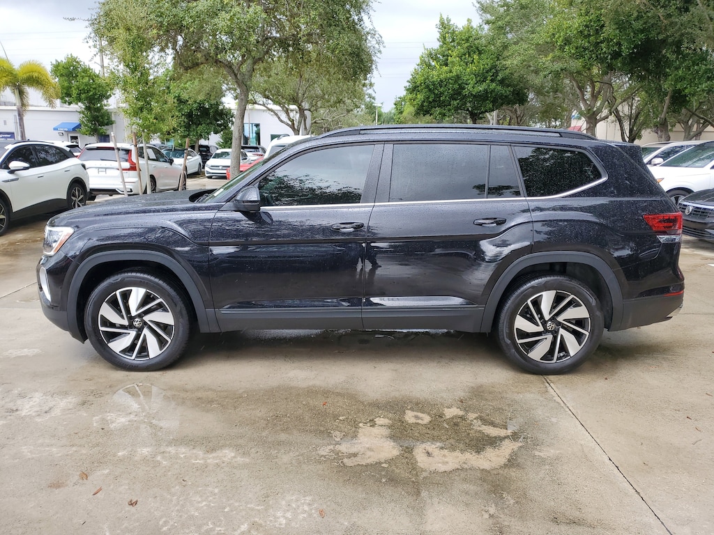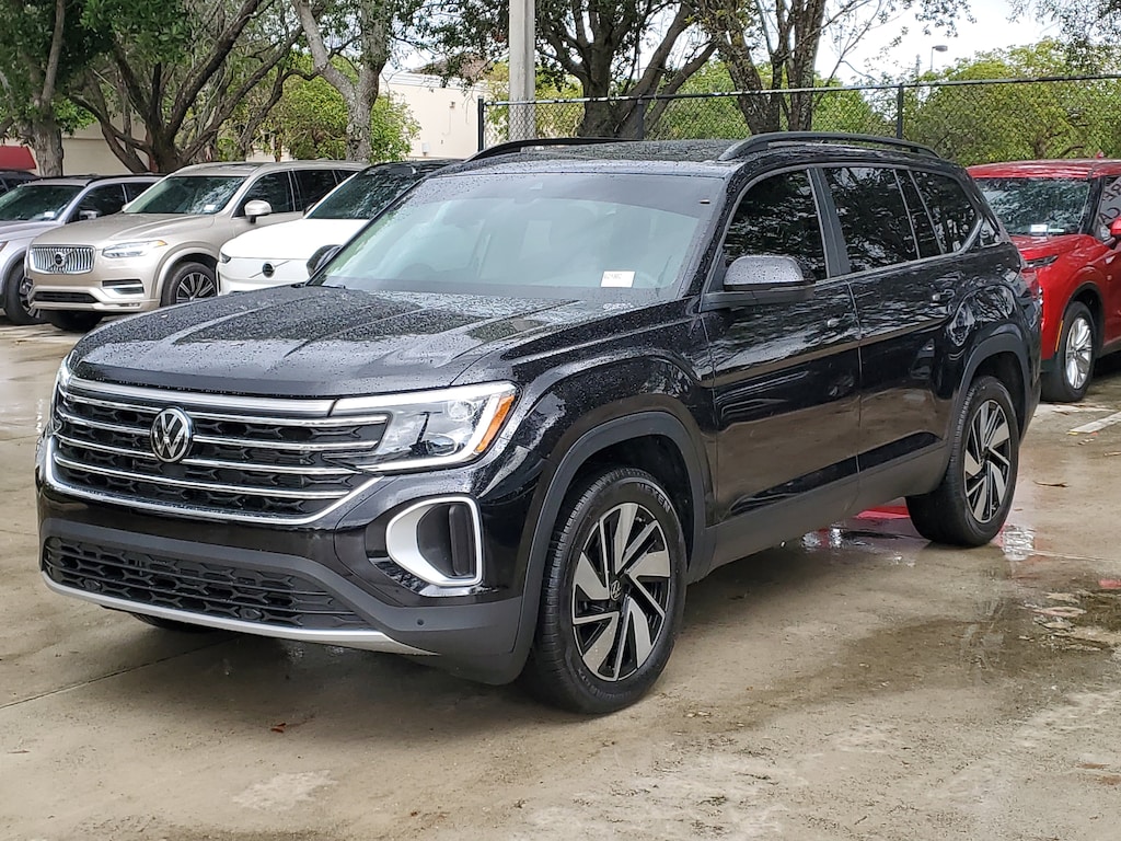 CARFAX One-Owner. Deep Black 2025 Volkswagen Atlas 2.0T SE w/Technology 2.0L TSI 8-Speed Automatic with Tiptronic FWD Panoramic sunroof package (power tilting and sliding Panoramic sunroof), 20" 2-tone machined alloy wheels, 2nd-row dual captain's chairs, 33-month SiriusXM service extension subscription, 3rd row seats: split-bench, 4-Wheel Disc Brakes, 6 Speakers, ABS brakes, Air Conditioning, Alloy wheels, AM/FM radio: SiriusXM with 360L, Auto High-beam Headlights, Auto-dimming Rear-View mirror, auto-dimming rearview mirror with HomeLink Connect, Automatic temperature control, Brake assist, Bumpers: body-color, Compass, Delay-off headlights, Driver door bin, Driver vanity mirror, Dual front impact airbags, Dual front side impact airbags, Electronic Stability Control, Emergency communication system: VW Car-Net Safe & Secure 5-year, Exterior Parking Camera Rear, first aid kit, Four wheel independent suspension, four-wheel independent suspension, Front anti-roll bar, Front Bucket Seats, Front Center Armrest, Front dual zone A/C, Front fog lights, Front reading lights, Fully automatic headlights, heated and Actively ventilated front bucket seats, Heated door mirrors, Heated front seats, Heated steering wheel, heavy duty trunk liner with VW CarGo blocks, Illuminated entry, Low tire pressure warning, MIB3 composition media radio, Occupant sensing airbag, Outside temperature display, Overhead airbag, Overhead console, Panic alarm, Passenger door bin, Passenger vanity mirror, perforated V-Tex leatherette seating surfaces, Power door mirrors, Power driver seat, Power Liftgate, Power steering, Power windows, Radio data system, Rain sensing wipers, Rear air conditioning, Rear anti-roll bar, Rear reading lights, Rear seat center armrest, Rear window defroster, Rear window wiper, Remote keyless entry, roadside assistance kit, rubber mats kit (2-row), Security system, Speed control, Speed-sensing steering, Split folding rear seat, Spoiler, Steering wheel mounted audio controls, Tachometer, Telescoping steering wheel, Tilt steering wheel, Traction control, Trip computer, Turn signal indicator mirrors, Variably intermittent wipers, Ventilated front seats, and Volkswagen logo puddle lights.