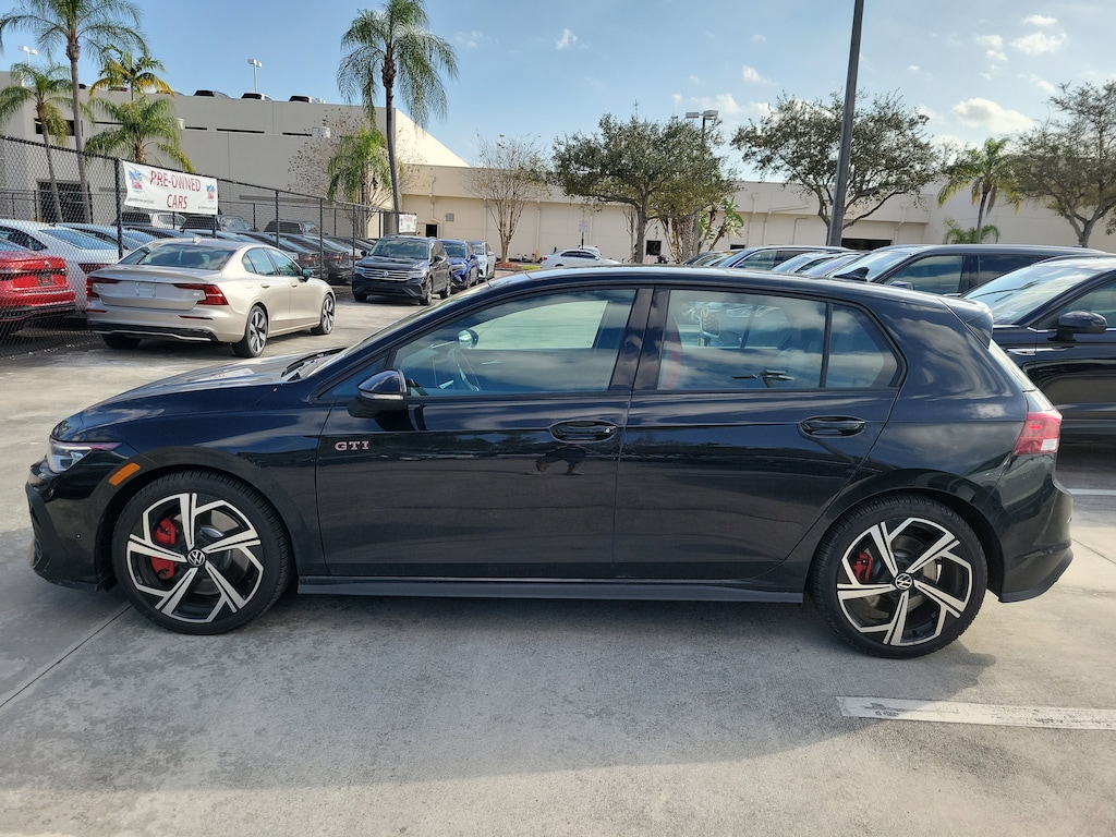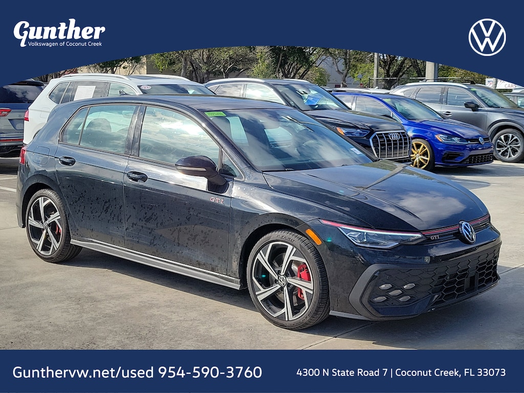 Recent Arrival! CARFAX One-Owner. Black Metallic 2025 Volkswagen Golf GTI 2.0T SE 2.0L TSI DOHC 7-Speed DSG Automatic with Tiptronic FWD SE Leather Seating Package (Actively Ventilated Front Seats, Padded Door Panels with Leatherette Inserts, Perforated Vienna Leather Seating Surfaces, and Power Adjustable Driver's Seat w/3 Position Memory), 4-Wheel Disc Brakes, 9 Speakers, ABS brakes, Air Conditioning, Alloy wheels, AM/FM radio: SiriusXM with 360L, ArtVelours Seating Surfaces, Auto High-beam Headlights, Auto-dimming Rear-View mirror, Automatic temperature control, Brake assist, Bumpers: body-color, Compass, Delay-off headlights, Driver door bin, Driver vanity mirror, Dual front impact airbags, Dual front side impact airbags, Electronic Stability Control, Emergency communication system: VW Car-Net Safe & Secure 5-year, Exterior Parking Camera Rear, Forward collision: FCW w/Autonomous Emergency Braking mitigation, Four wheel independent suspension, Front anti-roll bar, Front Bucket Seats, Front Center Armrest, Front fog lights, Front reading lights, Fully automatic headlights, harman/kardon® Speakers, Heated door mirrors, Heated front seats, Heated Front Top Sport Seats, Heated steering wheel, Illuminated entry, Leather steering wheel, Low tire pressure warning, Navigation System, Occupant sensing airbag, Outside temperature display, Overhead airbag, Overhead console, Panic alarm, Passenger door bin, Passenger vanity mirror, Power door mirrors, Power driver seat, Power moonroof: Panoramic, Power passenger seat, Power steering, Power windows, Radio data system, Radio: MIB3 Discover Pro AM/FM/HD With12.9" Touchscreen Navigation, Rain sensing wipers, Rear anti-roll bar, Rear reading lights, Rear seat center armrest, Rear window defroster, Rear window wiper, Remote keyless entry, Security system, Speed control, Speed-sensing steering, Speed-Sensitive Wipers, Split folding rear seat, Spoiler, Sport steering wheel, Steering wheel mounted audio controls, Tachometer, Telescoping steering wheel, Tilt steering wheel, Traction control, Trip computer, Turn signal indicator mirrors, Variably intermittent wipers, and Wheels: 18" 2-Tone Diamond-Turned Alloy.