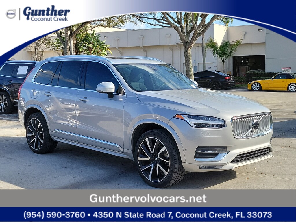 CARFAX One-Owner. Silver 2023 Volvo XC90 B6 Plus 7-Seater 2.0L I4 Turbocharged DOHC 16V LEV3-ULEV70 Automatic with Geartronic AWD Protection Package Premier (Bumper Cover, Cargo Tray, First Aid Kit, Rubber Floor Mats, and Wheel Locks), 10 Speakers, 3rd row seats: bucket, 4-Wheel Disc Brakes, ABS brakes, Air Conditioning, Alloy wheels, AM/FM radio: SiriusXM, Anti-whiplash front head restraints, Apple CarPlay, Auto High-beam Headlights, Auto-dimming door mirrors, Auto-dimming Rear-View mirror, Automatic temperature control, Brake assist, Bumpers: body-color, Delay-off headlights, Driver door bin, Driver vanity mirror, Dual front impact airbags, Dual front side impact airbags, Electronic Stability Control, Emergency communication system: Volvo Cars App w/4 Year Subscription, Exterior Parking Camera Rear, Four wheel independent suspension, Front anti-roll bar, Front Bucket Seats, Front Center Armrest w/Storage, Front dual zone A/C, Front fog lights, Front reading lights, Fully automatic headlights, Garage door transmitter: HomeLink, Genuine wood dashboard insert, Genuine wood door panel insert, Headlight cleaning, Heated door mirrors, Heated Front Bucket Seats, Heated front seats, Heated rear seats, Heated steering wheel, Illuminated entry, Integrated rear child seats, Knee airbag, Leather Shift Knob, Leather Upholstery, Low tire pressure warning, Luggage Cover, Memory seat, Navigation System, Occupant sensing airbag, Outside temperature display, Overhead airbag, Panic alarm, Passenger door bin, Passenger vanity mirror, Power door mirrors, Power driver seat, Power moonroof, Power passenger seat, Power steering, Power windows, Radio data system, Radio: High Performance Audio System, Rain sensing wipers, Rear air conditioning, Rear anti-roll bar, Rear dual zone A/C, Rear fog lights, Rear reading lights, Rear seat center armrest, Rear window defroster, Rear window wiper, Remote keyless entry, Security system, Speed control, Speed-sensing steering, Split folding rear seat, Spoiler, Steering wheel mounted audio controls, Tachometer, Telescoping steering wheel, Traction control, Trip computer, Turn signal indicator mirrors, Variably intermittent wipers, Wheels: 20" 5-Spoke Black Diamond Cut Alloy, and Wheels: 21" 5 V-Spoke Black Diamond Cut Alloy.