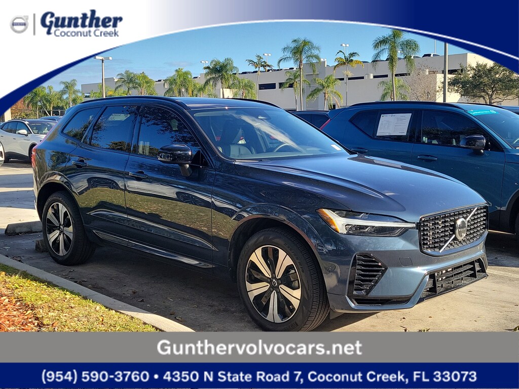 CARFAX One-Owner. Denim Blue Metallic 2024 Volvo XC60 Recharge Plug-In Hybrid T8 Plus Dark Theme 2.0L I4 Hybrid Turbocharged DOHC 16V LEV3-SULEV30 Automatic with Geartronic AWD Protection Package Premier (All-Weather Floor Mats, Bumper Cover, Cargo Tray, First Aid Kit, and Wheel Locks), 11 Speakers, 4-Wheel Disc Brakes, ABS brakes, Air Conditioning, Alloy wheels, AM/FM radio: SiriusXM, Anti-whiplash front head restraints, Apple CarPlay, Auto High-beam Headlights, Auto-dimming door mirrors, Auto-dimming Rear-View mirror, Automatic temperature control, Brake assist, Bumpers: body-color, Delay-off headlights, Driver door bin, Driver vanity mirror, Dual front impact airbags, Dual front side impact airbags, Electronic Stability Control, Emergency communication system: Volvo Cars App w/4 Year Subscription, Exterior Parking Camera Rear, Four wheel independent suspension, Front anti-roll bar, Front Bucket Seats, Front Center Armrest, Front dual zone A/C, Front reading lights, Fully automatic headlights, Garage door transmitter: HomeLink, Genuine wood console insert, Genuine wood dashboard insert, Heated door mirrors, Heated Front Bucket Seats, Heated front seats, Illuminated entry, Knee airbag, Leather Shift Knob, Leather Upholstery, Low tire pressure warning, Memory seat, Occupant sensing airbag, Outside temperature display, Overhead airbag, Panic alarm, Passenger door bin, Passenger vanity mirror, Power door mirrors, Power driver seat, Power moonroof, Power Operated Tailgate, Power passenger seat, Power steering, Power windows, Radio data system, Radio: High Performance Audio System, Rain sensing wipers, Rear anti-roll bar, Rear fog lights, Rear reading lights, Rear seat center armrest, Rear window defroster, Rear window wiper, Remote keyless entry, Security system, Speed control, Split folding rear seat, Spoiler, Steering wheel mounted audio controls, Tachometer, Telescoping steering wheel, Tilt steering wheel, Traction control, Trip computer, Turn signal indicator mirrors, Variably intermittent wipers, and Wheels: 19" 5-Double Spoke Black Diamond Cut Alloy.