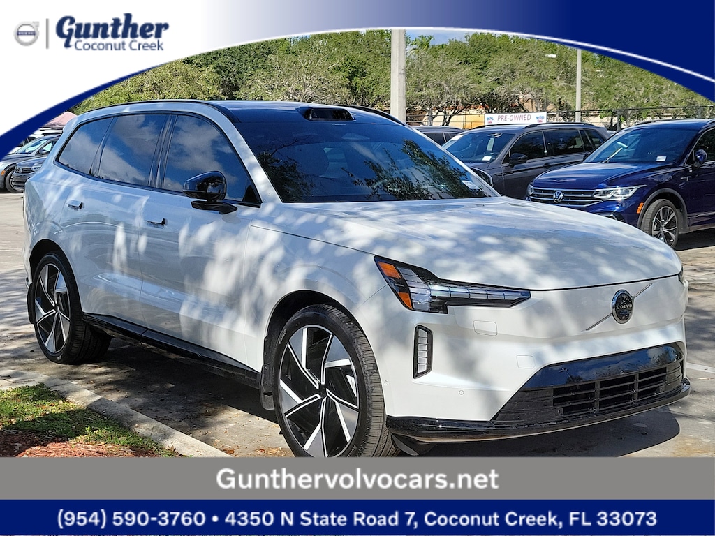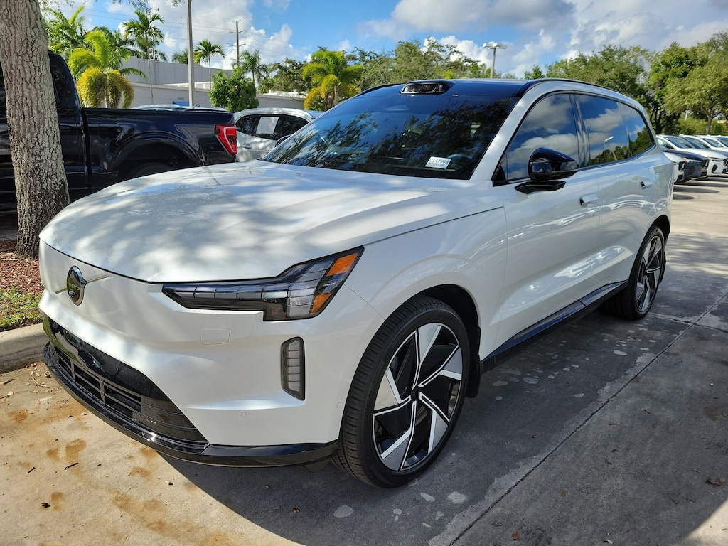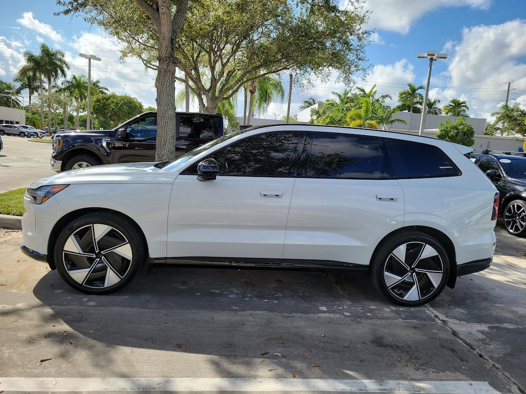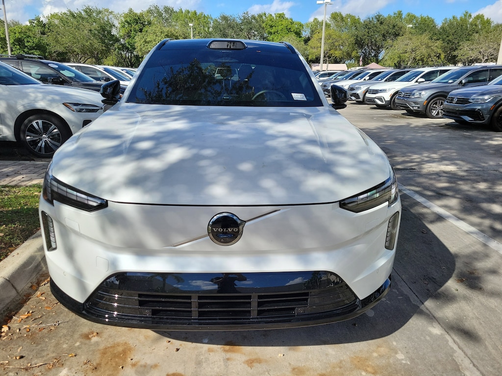 CARFAX One-Owner. Crystal White 2025 Volvo EX90 Twin Motor Ultra 7-Seater Electric Motor 1-Speed Automatic AWD 14 Speakers, 3rd row seats: bucket, 4-Wheel Disc Brakes, ABS brakes, Adaptive suspension, Air Conditioning, Alloy wheels, AM/FM radio: SiriusXM, Anti-whiplash front head restraints, Auto High-beam Headlights, Auto-dimming door mirrors, Auto-dimming Rear-View mirror, Auto-leveling suspension, Automatic temperature control, Brake assist, Bumpers: body-color, Delay-off headlights, Driver door bin, Driver vanity mirror, Dual front impact airbags, Dual front side impact airbags, Electronic Stability Control, Emergency communication system: Volvo Cars App w/4 Year Subscription, Exterior Parking Camera Rear, Four wheel independent suspension, Front anti-roll bar, Front Bucket Seats, Front Center Armrest w/Storage, Front dual zone A/C, Front reading lights, Fully automatic headlights, Genuine wood console insert, Genuine wood dashboard insert, Genuine wood door panel insert, Headlight cleaning, Heads-Up Display, Heated door mirrors, Heated Front Seats, Heated front seats, Heated rear seats, Heated steering wheel, Illuminated entry, Integrated rear child seats, Knee airbag, Low tire pressure warning, Navigation System, Nordico Upholstery, Occupant sensing airbag, Outside temperature display, Overhead airbag, Panic alarm, Passenger door bin, Passenger vanity mirror, Power door mirrors, Power driver seat, Power Liftgate, Power passenger seat, Power steering, Power windows, Radio data system, Radio: Bose Performance Audio w/14 Speakers, Rain sensing wipers, Rear air conditioning, Rear anti-roll bar, Rear dual zone A/C, Rear fog lights, Rear reading lights, Rear seat center armrest, Rear window defroster, Rear window wiper, Security system, Speed control, Split folding rear seat, Spoiler, Steering wheel mounted audio controls, Telescoping steering wheel, Tilt steering wheel, Traction control, Trip computer, Turn signal indicator mirrors, Variably intermittent wipers, and Wheels: 21" 8-Spoke Aero.